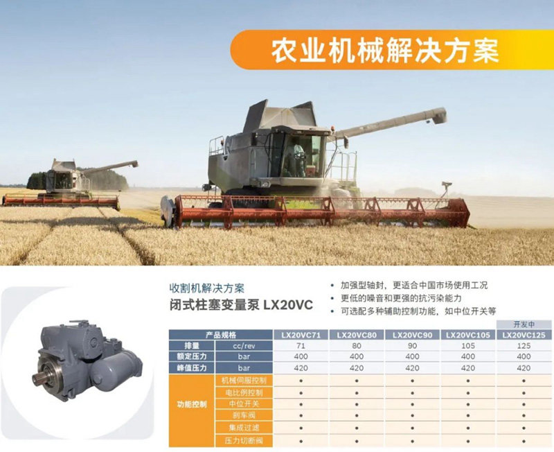 随着收获机械的大型化和多功能化的发展,静液压驱动的配置比例越来越高。为了适应市场的变化,和提升产品在该应用环境下的可靠性,乐卓液压推出了最新的适用于收获机械的闭式柱塞泵LX20VC: